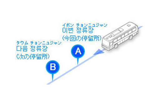 韓国語での停留所アナウンスを聞くときに気をつけたいのが、「이번 정류장(イボン チョンニュジャン、今回の停留所)」と「다음 정류장(タウムチョンニュジャン、次の停留所」。韓国のバスは到着直前に、まもなく到着する直近の停留所名とその次に停まる停留所名の2つがアナウンスされます。ここで注意すべきは、韓国ではまもなく到着する停留所が「イボン チョンニュジャン(今回の停留所)」としてアナウンスされること!目的地が「タウム チョンニュジャン(次の停留所)」として放送されたときに降りると、ひとつ手前で降りてしまうことになるので要注意です。