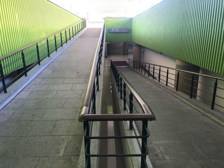到着ロビーから一度外に出て、横断歩道を渡ったところにあるスロープを利用します。スロープを下りて行くと上記アクセス2の場所に通じています。