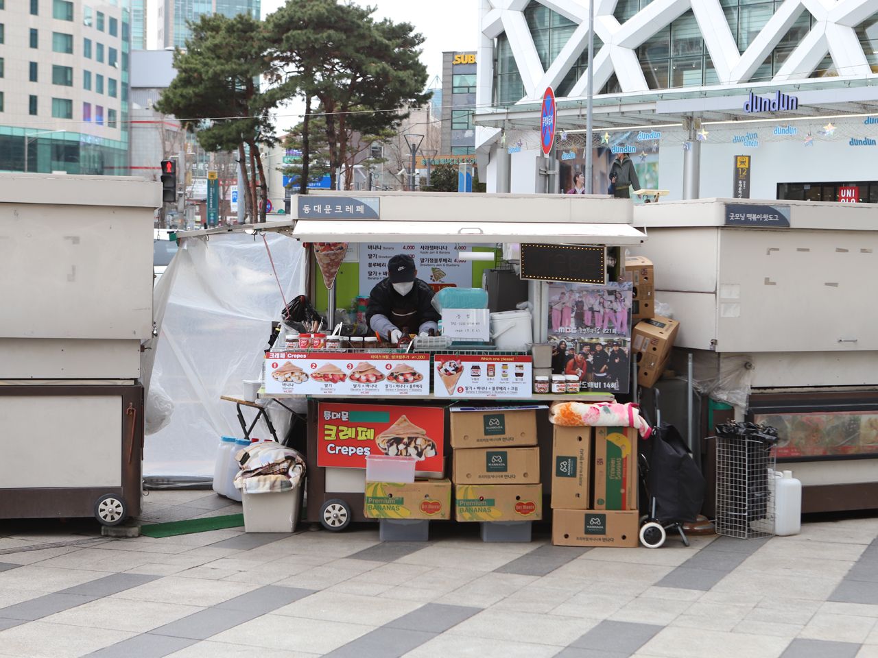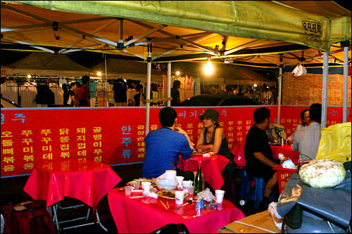 東大門の深夜、道路沿いや卸売ビル前にずらりと現れる屋台型のテントで、黄色いビニール素材のテントが連なる光景から「黄色いテント」と呼ばれています。