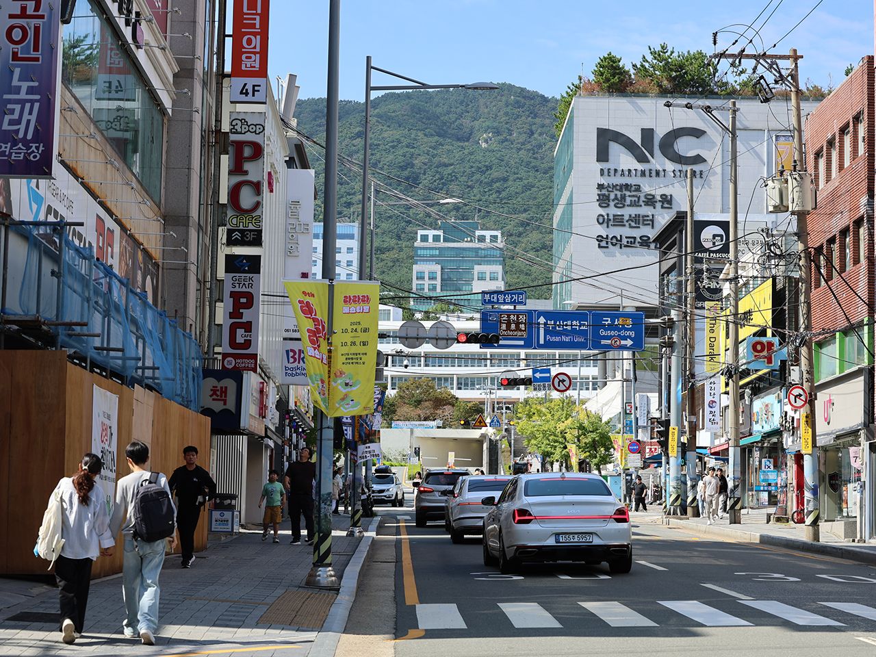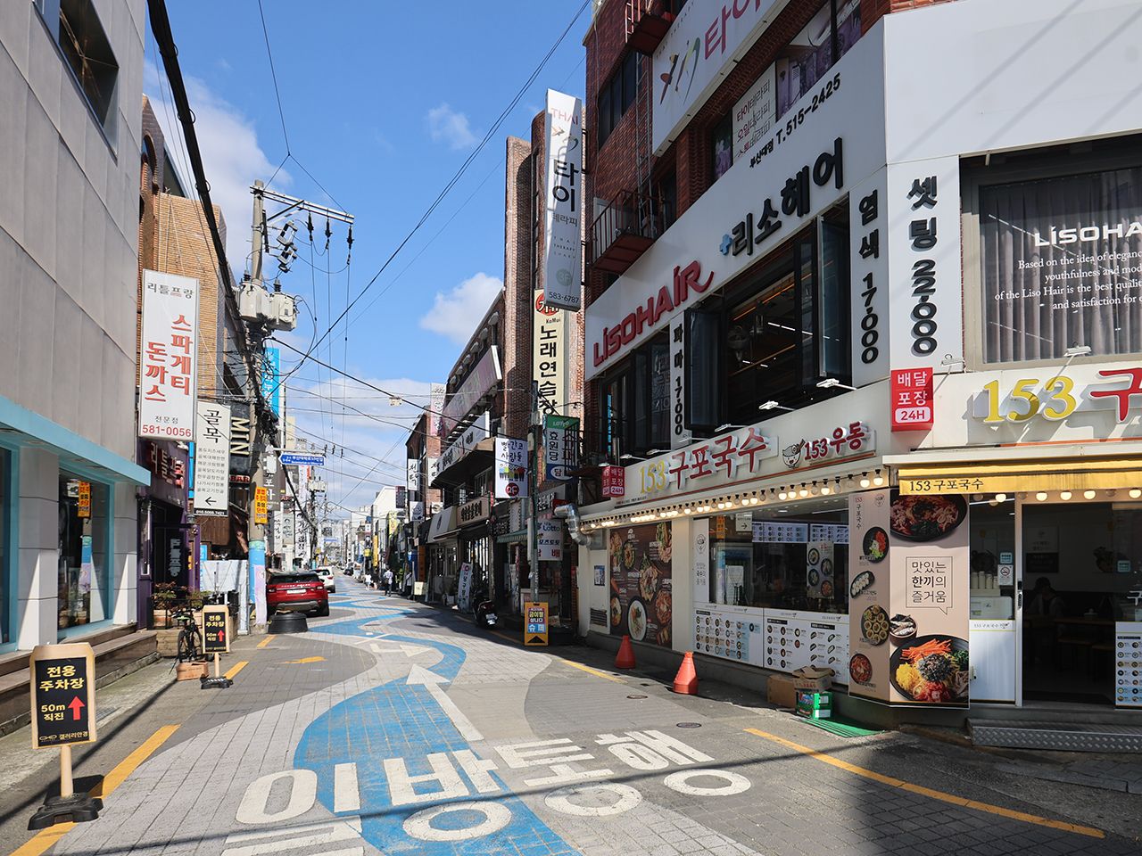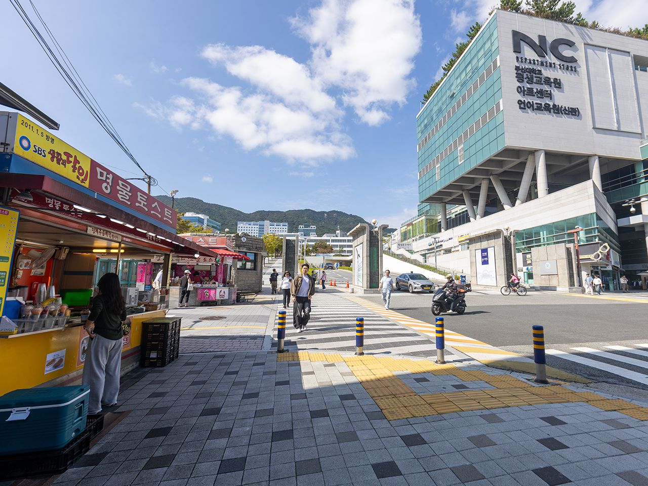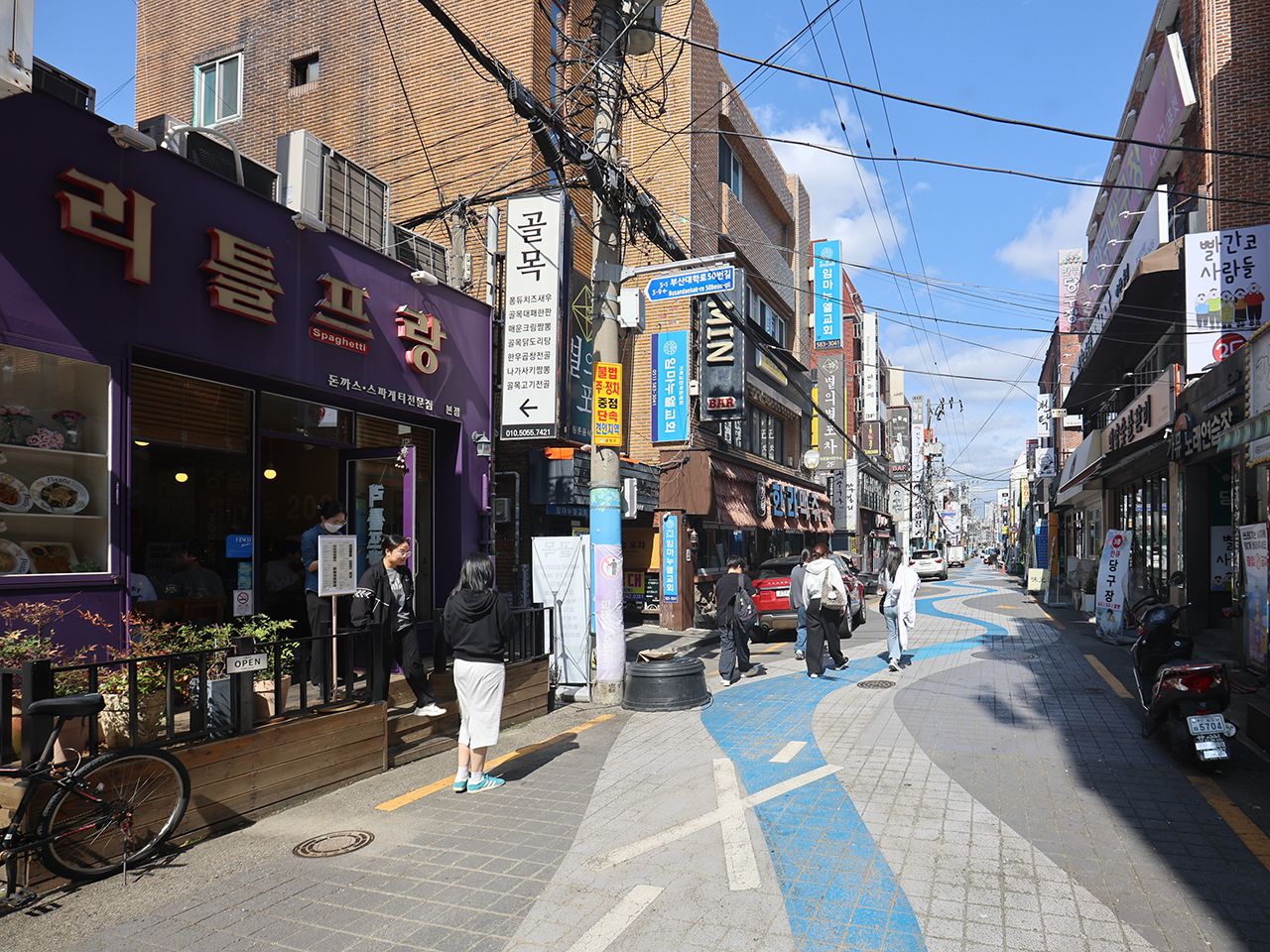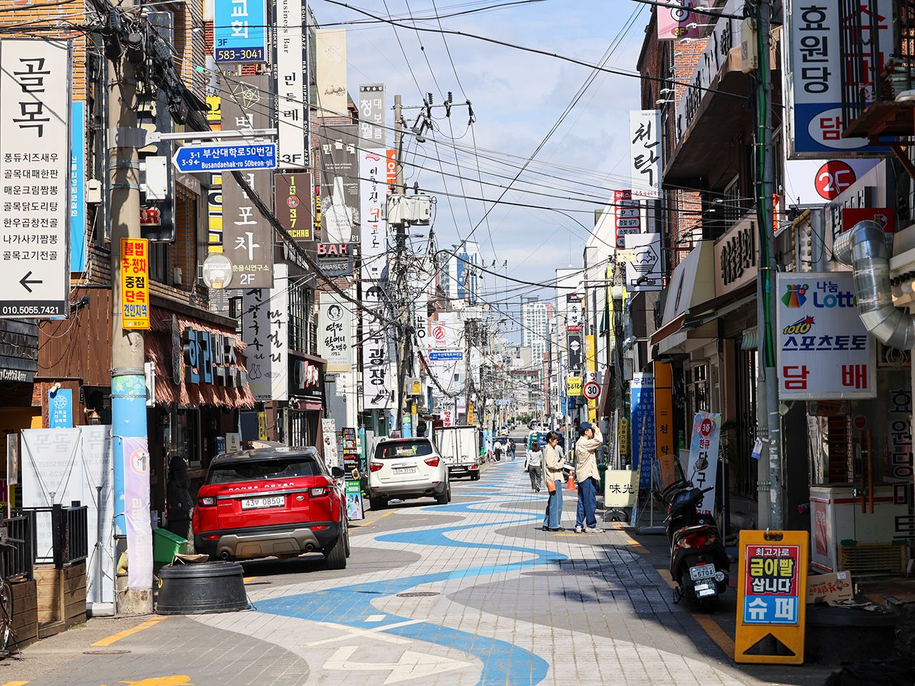 釜山大学周辺は、学生街らしく手頃なグルメ店やカフェが立ち並び、活気のある雰囲気です。