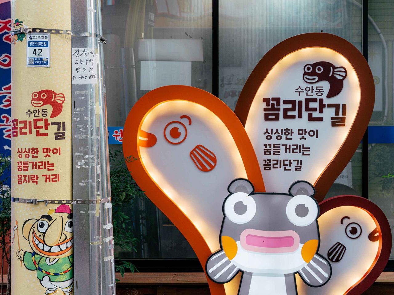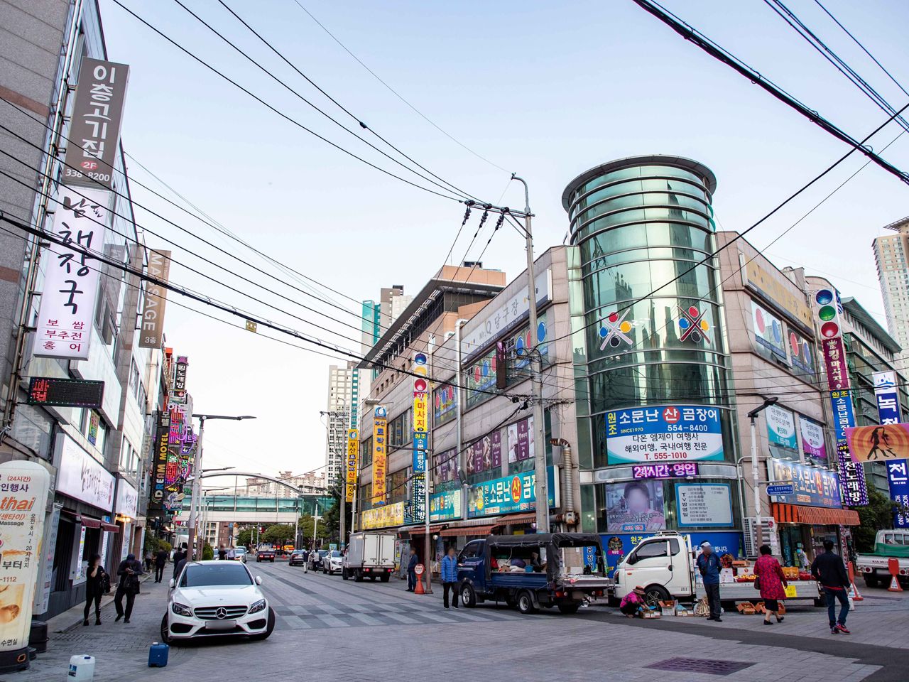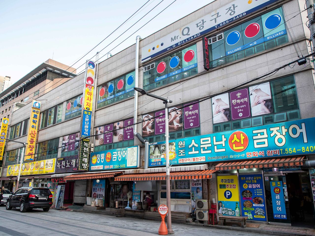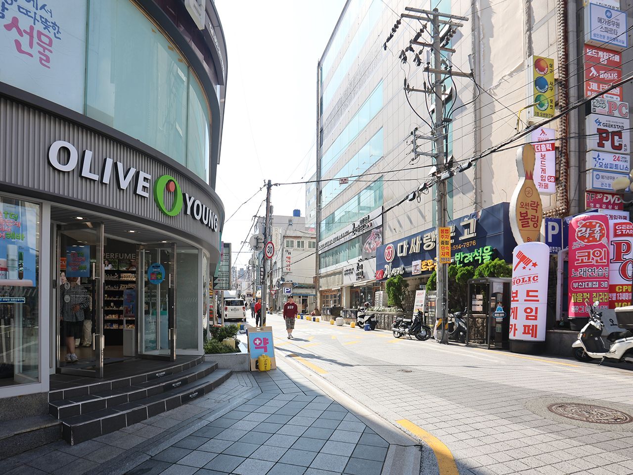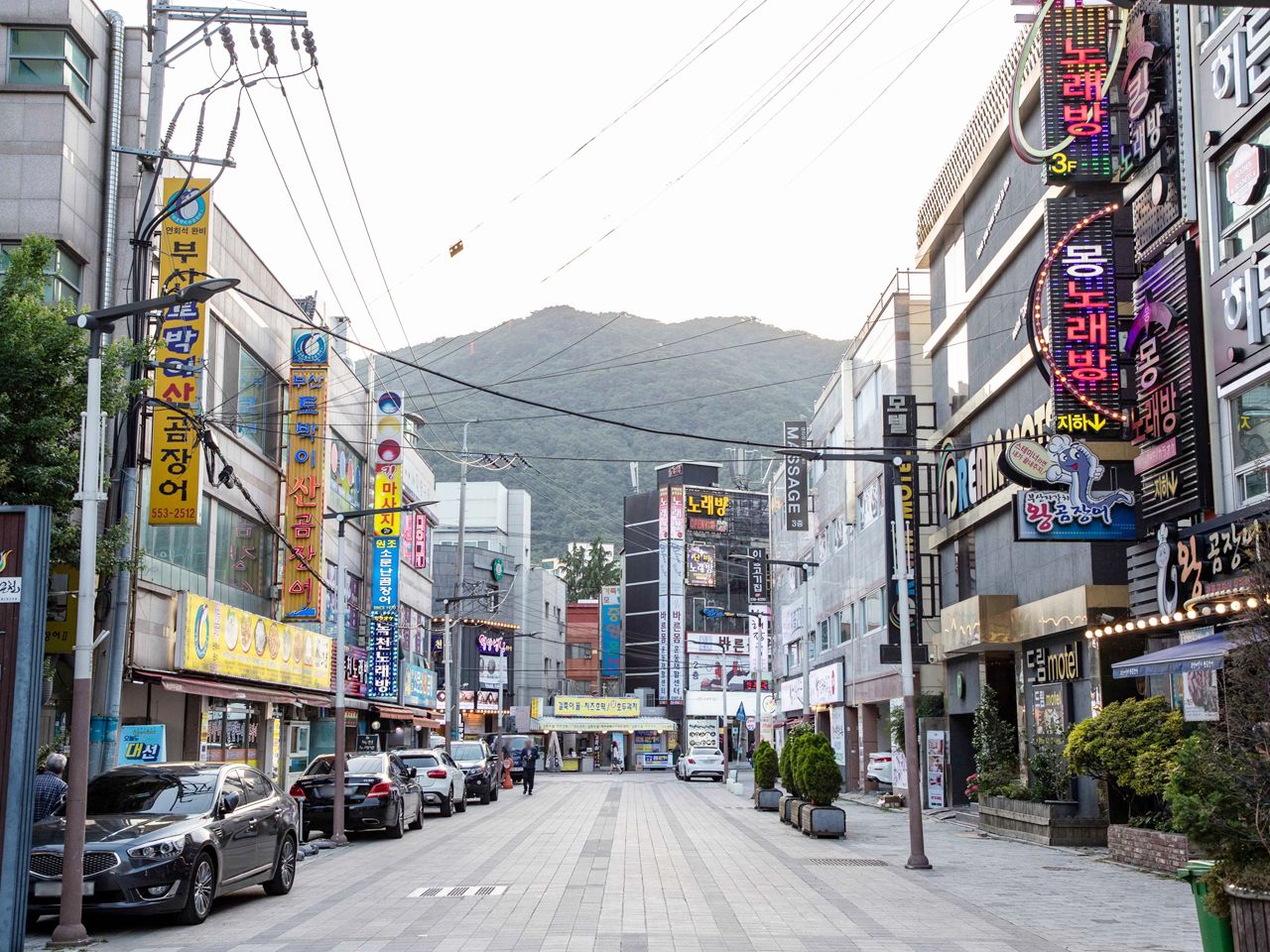 釜山大学周辺は、学生街らしく手頃なグルメ店やカフェが立ち並び、活気のある雰囲気です。