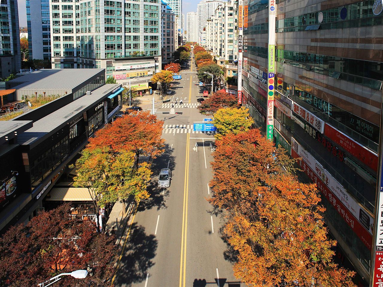 地下鉄盆唐線の各駅を中心に自然や一般住宅、高級アパートが計画的に整備された街で、点在するカフェ通りが有名です。