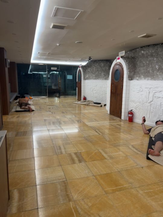 風呂は3つで水風呂、50度の湿式サウナ、100度の乾式サウナもあります。チムジルバンには壁沿いに5つのプルガマが並び、アイスルームもありました。睡眠室の前にマットと掛け布、枕が置いてあります。睡眠室は二段になっているので、寝やすい下段にしましたが、中は真っ暗でしばらく何も見えなかったです。換気扇の音が意外と大きくとでも気になりました。