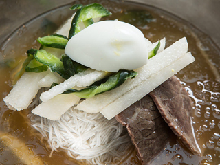 | 丸ごと、または大きめに切った大根を塩水に漬け、熟成させた水キムチの一種。ほのかな酸味が口の中をさっぱりさせてくれ、また大根には消化を助ける作用もあるため、肉料理の付け合せとしてよく提供されます。爽やかな味わいの汁は、牛骨だしと混ぜ合わせて冷麺のスープにも使われます。 |