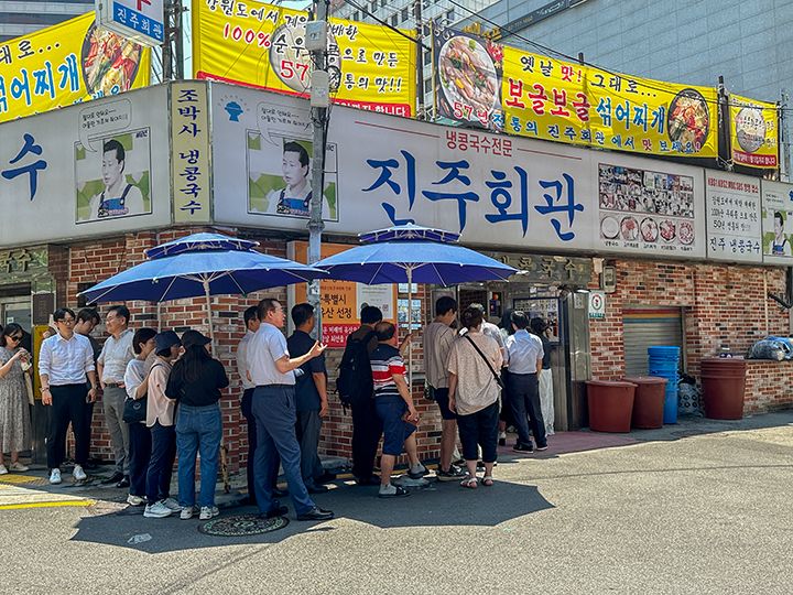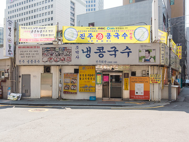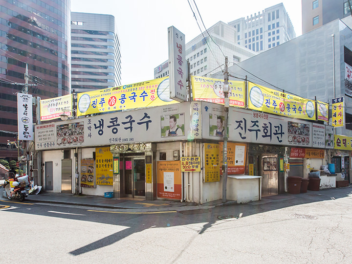 「晋州会館(チンジュフェグァン)」はコングクスが有名な1962年創業の老舗店です。伝統の味を求めて訪れる人たちで毎日賑わい、「ソウル3大コングクス」の一つに数えられるようになってからは、若い世代の間でも話題に。江原道(カンウォンド)の契約農場で栽培された豆を100%使用しており、他店のものと比べるとスープがとても濃厚で豆の味が引き立っています。塩で味を整える必要がなく、味に変化が欲しいときは自家製のキムチと一緒に食べるとより美味しくいただけます。ほか、目の前でスタッフが調理してくれる具だくさんの「キムチポックムパッ」などもおすすめ。場所は市庁駅近く、座席数は多いですが、ランチタイムは周辺の会社員たちで行列ができるので避けるのがベター。支払いは先払いです。