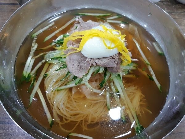 6月末の旅の初日にひとりで行きました。長いバス移動で疲れていたので、ミルミョンとビールを目当てに。でも店の入り口の冷蔵庫が空っぽ!ビール売り切れか?と不安になり店の前でキョロキョロしていたらお店のアジュマが「どうしたの?入りなさいよ~」と。「あの、ビールありますか?」「この冷蔵庫にはないけど奥の冷蔵庫にはちゃんとあるから、安心して入りなさいよ~(笑)」韓国語での会話も楽しかったです。冷麺とは違うスープと麺、やかんのダシ汁。なかなかいいですね~夏に食べたくなる味!気に入りました。ひとりだからマンドゥは我慢しましたが、店内のテレビ見ながらのんびりくつろげました!