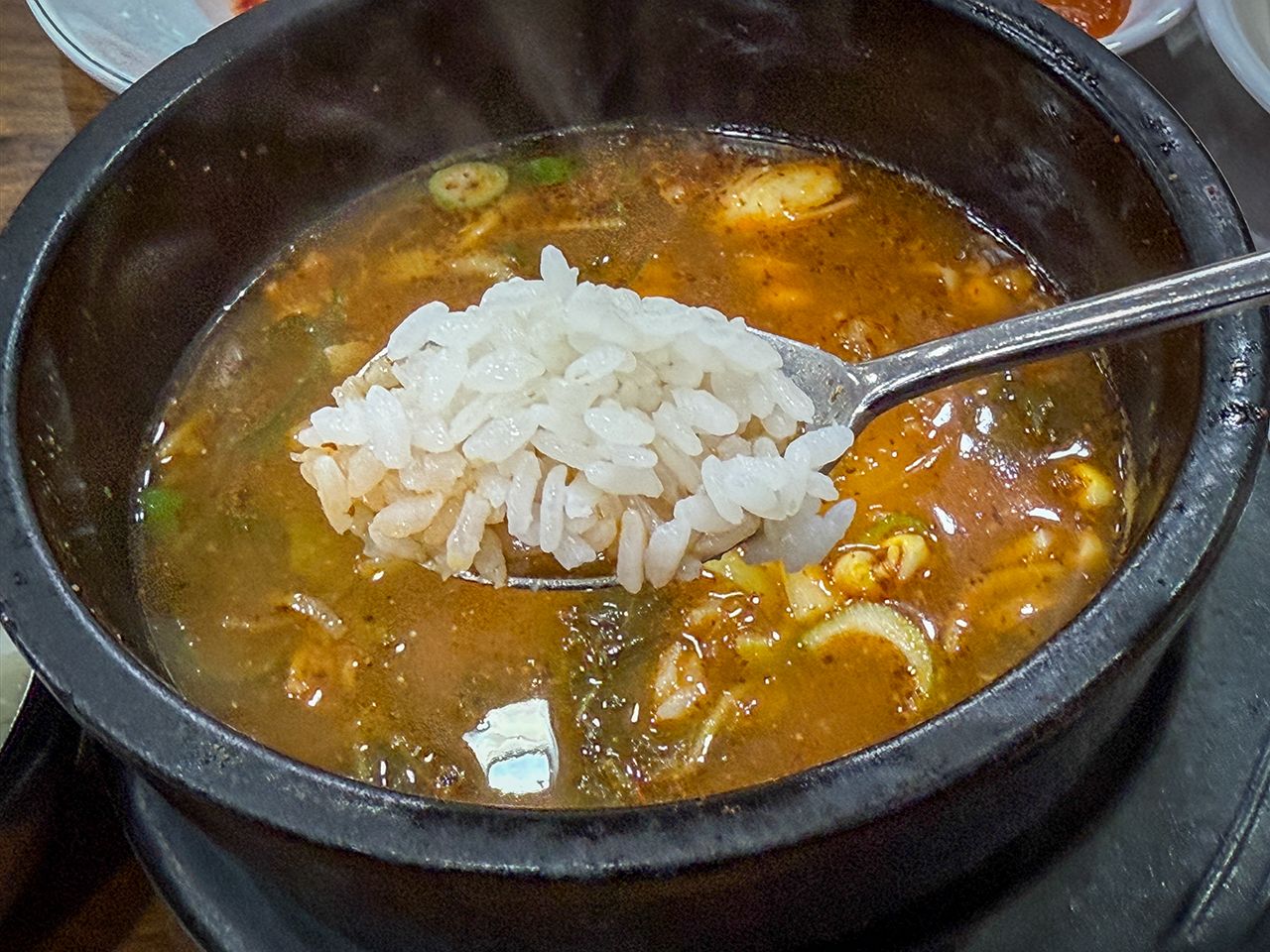 カムジャタンと同じスープとお肉を、1人前サイズの土鍋で味わえるのが「ピョヘジャングッ」で、ご飯付きの定食スタイルで提供されるので、ひとり旅の食事にもぴったりです。「カムジャタン」という名前で注文すると大鍋で提供されるので、オーダーの際はメニュー名をお間違えなく!