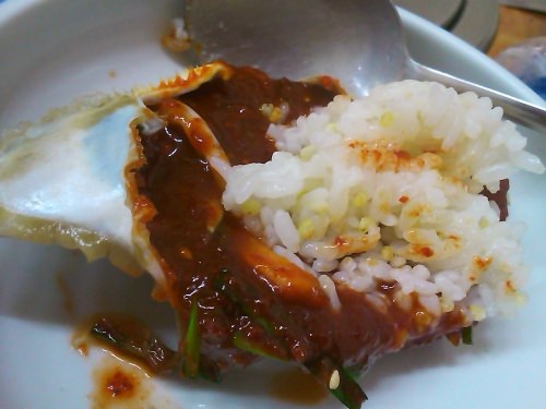 甘辛いヤンニョムでさらに食欲が増し、辛くなるとスープを飲み、中の具も豆もやしと貝がおいしく辛さを和らげ、またコッケジャンを食べるの繰り返しで・・・