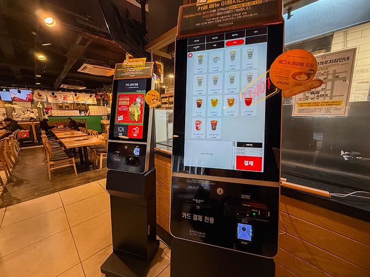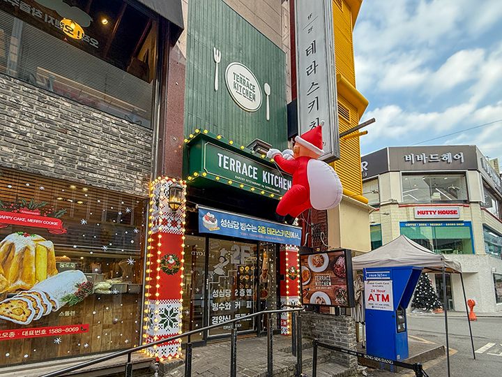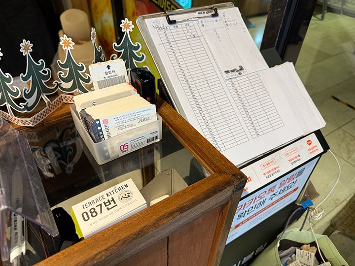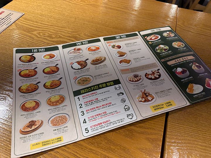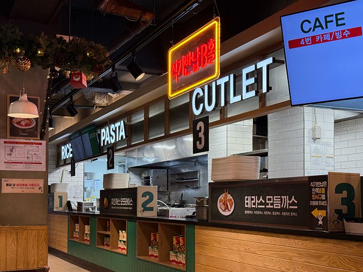 「Terrace Kitchen(テラスキッチン)」は、大田(テジョン)市を代表するベーカリー店「聖心堂(ソンシムダン)」の本店2階にある系列のブランチカフェです。パスタやトンカツといった軽食利用はもちろん、コーヒーなどのドリンクだけを注文してのカフェ利用もOK。1階の聖心堂で買ったパンを持ち込んで、店内で食べられます。週末の午後はウェイティングが発生することが多く、整理券方式で管理しています。注文は入口にあるタッチパネルを操作して、クレジットカードで決済。途中、韓国の携帯電話番号を入力する過程があり、持っていない場合は、010-1111-1111などの番号を入力して進み、レシートに書かれた注文番号が店内のモニターに表示されたら受け取り、食べ終わった食器は返却口に戻します。