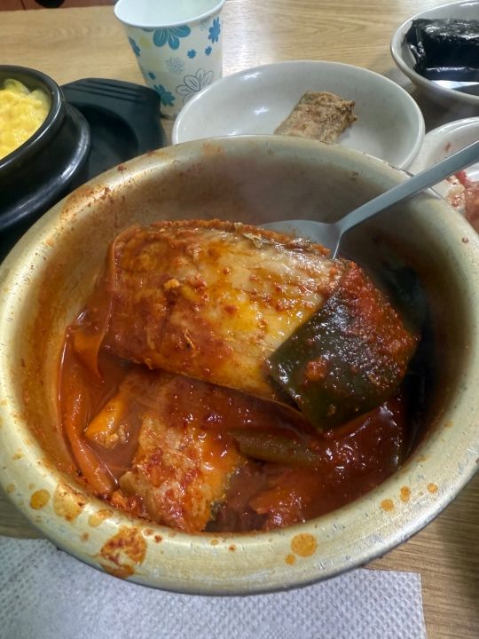 女子二人でコドゥンオジョリム2つを注文。さばは脂が乗っていて美味しかったですが、煮込み過ぎてしまっているのか味が濃すぎてしょっぱさを感じました。もともと煮込みだから濃いものなんでしょうけど、カルチジョリムを食べた時はこんなにもしょっぱさを感じなかったよなぁと。カルチジョリムは大根と煮込んでいましたが、コドゥンオジョリムは多量の白菜キムチと煮込まれており、食べきれませんでした。さばは一切れのみだったので、どちらかというと白菜キムチの量をもっと少なくしてさばをもう一切れの方がうれしいな。