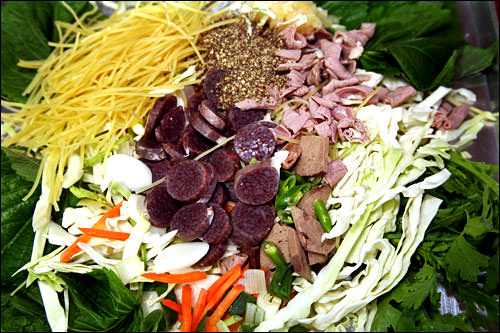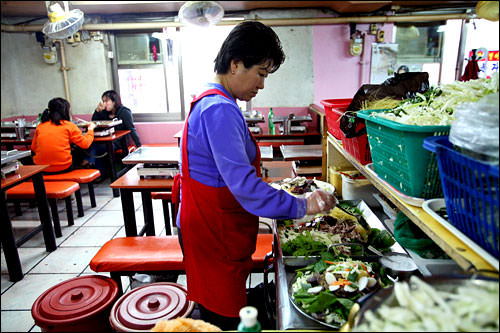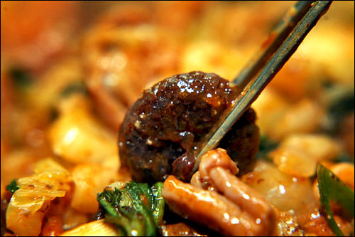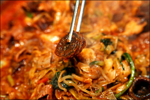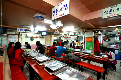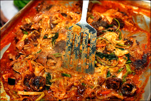 「サムチョンネチッ」が入店している「ヤンジ民俗スンデタウン」は、地下鉄2号線の「新林(シルリム)駅」から歩いて5分ほどの距離にあります。内装は、日本の昔ながらのお好み焼き屋のようで、気楽に立ち寄れるお店といった感じ。スンデとは韓国の豚の腸詰め料理で、そのスンデを鉄板で炒めた料理を「スンデコプチャン」と呼びます。スンデと一緒にホルモン、麺、エゴマの葉、にんじん、キャベツ、エゴマの粉、唐辛子、にんにく、お餅などの食材に秘伝のコチュジャンソースをくわえて、鉄板の上で炒めて出来上がり。スンデの食感、エゴマの香り、ソースの程よい辛みが、三味一体となって食欲をそそります。