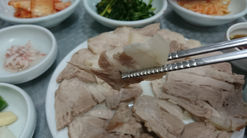 ・スユッを何もつけず食べるとやわらかく、臭みなく、肉のうまみが少し感じられる。