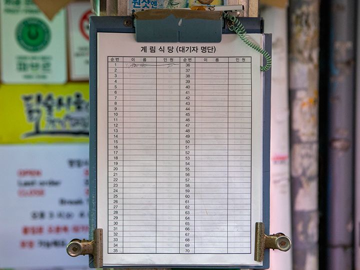 金曜の18時前の混む時間に到着してしまいかなり混んでました。順番待ちは入り口横の表に名前を書き込むシステム。呼び出しは番号を呼んでもらえるので、ハングルでなくても大丈夫。私は念のためローマ字で記入しました。