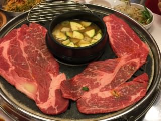 美味い食べ方は、わさび、醤油を日本から持参の上食べる(ここら辺の持ち込みは特に言われません)のと、テンジャンチゲが真ん中にセットされるのですが、脂多めのお肉を投入すると、このチゲがまた絶妙な味です…!