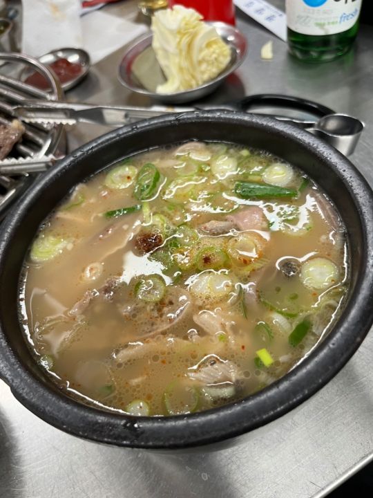 周りの店がガラガラなのに、この店だけほぼ満席。ビックリしました。メニューは他のコメントにあるとおり、金額までハングルなので、値段など気にせずネジャンコムタンをオーダー。