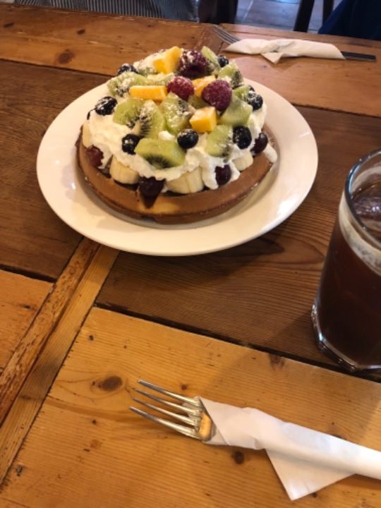 ワッフルも種類がありましたが、果物ワッフル+アメリカーノ2杯のセット、カプチーノ、アイスティーを頼みました。