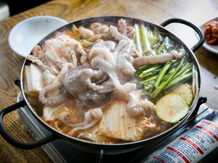1992年に開業した栄養満点のテナガダコ専門店で、韓国の人気グルメ番組で取り上げられたり、日本の韓国グルメ書籍にも掲載された有名店です。韓国西海岸でとれるテナガダコ(韓国語でサンナッチまたはサンナクチと発音)を用いた各メニューが人気で、鉄板炒め、鍋料理、お刺身にした踊り食いなどがあります。日本からの観光客がよく注文するのは濃厚な海鮮スープが味わい深い「テナガダコ鍋(サンナッチ・チョンゴル)」。特に生きたテナガダコが鍋に投入される光景は迫力満点!写真や動画の準備を忘れずに。鍋には麺を追加して食べたり、シメにはだし汁を使った焼き飯(ポックムパッ)が定番です。店舗は鐘路3街(チョンノサムガ)駅の近く。仁寺洞(インサドン)や益善洞(イクソンドン)からも徒歩圏内です。