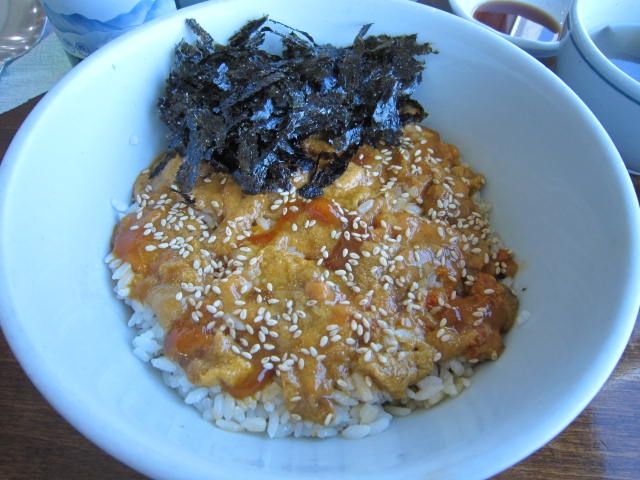 お目当てのウニ丼は、量は少なめですが、臭みは全くなく新鮮さがわかります。最初は混ぜずにひとくち、あとは韓国式に、底に仕込まれたゴマ油とよく混ぜていただきました。日本人なら素材の味を大切に・・・と言いたいところですが、ゴマ油と海の幸の絶妙なコラボレーションもやっぱり美味しい!郷に入っては郷に従え!ですね。