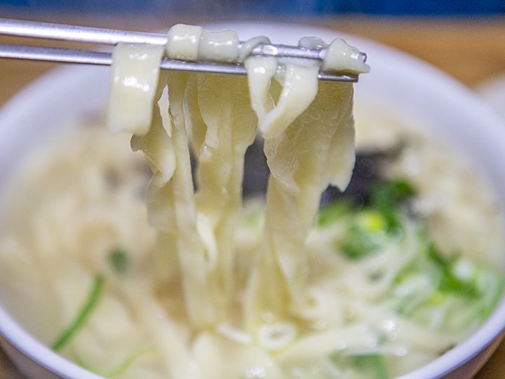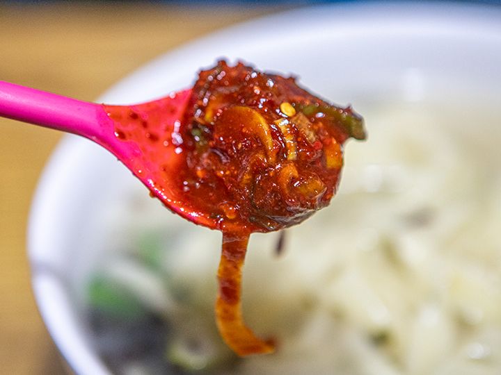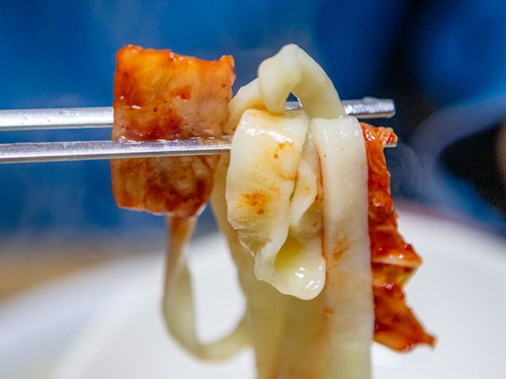 スープはとても淡白なので、キムチをつまみながらモチモチの麺を食べると相性抜群です!