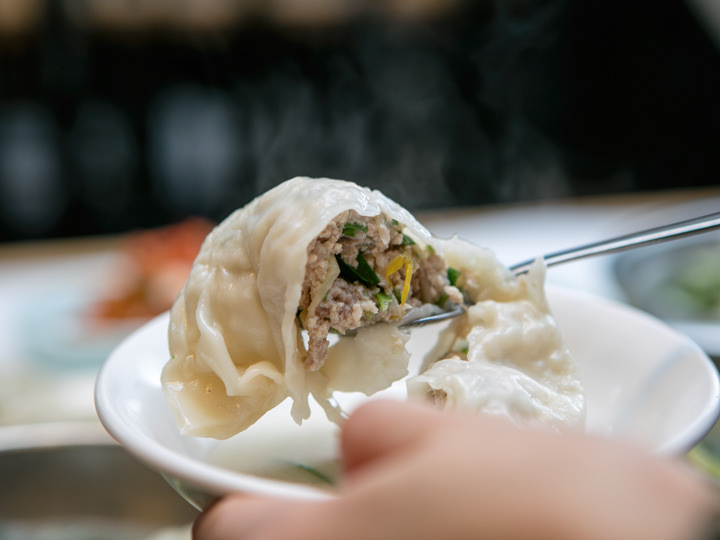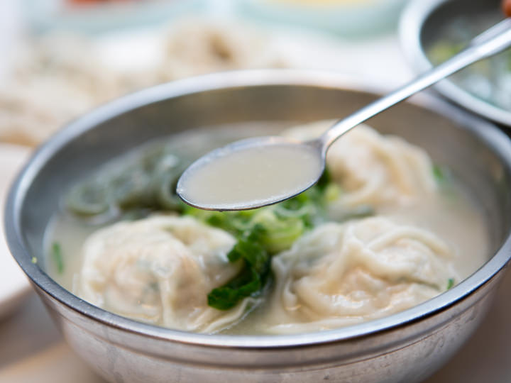 材料はすべて手作りで、カルグクスの麺にはヨモギが練り込まれ、緑色で栄養価が高いのが特徴。看板メニューの「ソンマンドゥカルグクス」は、あっさりとした牛骨スープの中に、ヨモギ麺と、具だくさんのマンドゥが入った満足感たっぷりの一杯です。