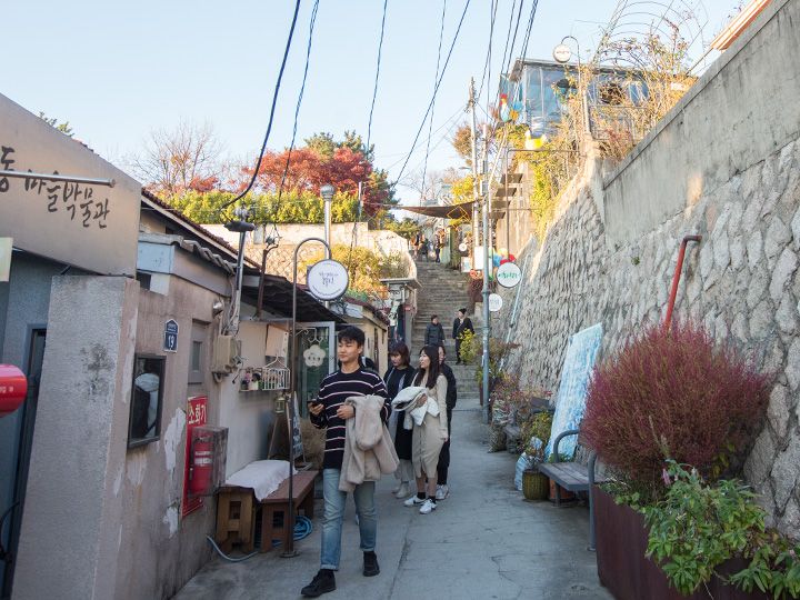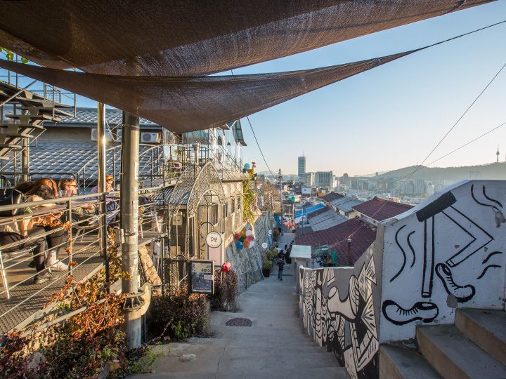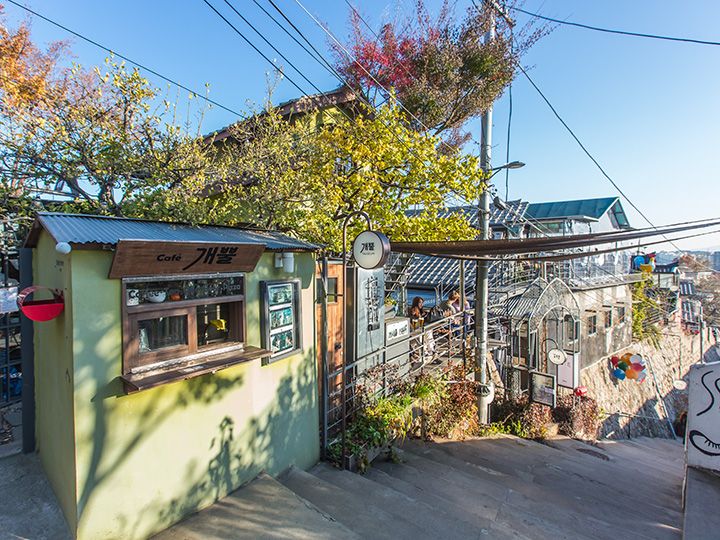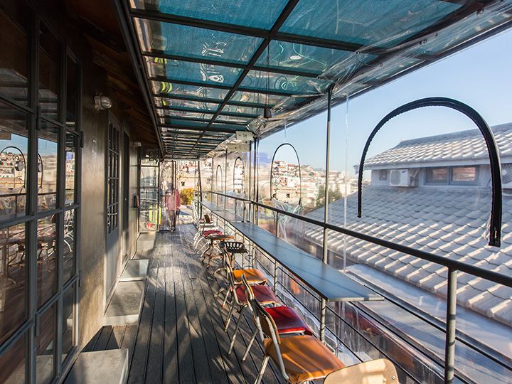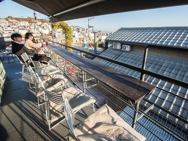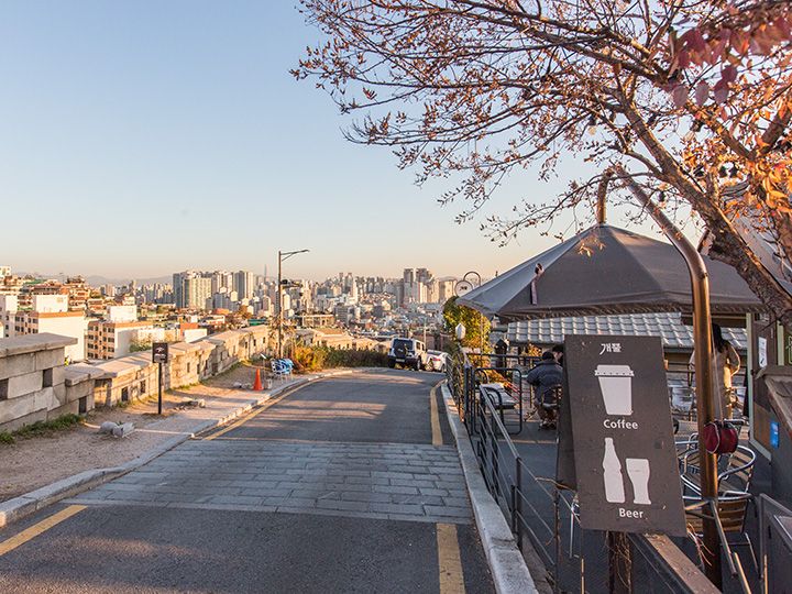 大学路(テハンノ)エリアの東側には、丘の上の公園「駱山(ナッサン)公園」があり、ソウル城郭沿いに設けられた公園からは周辺の景色が一望でき、ソウルの夜景スポットとしても人気があります。城郭沿いの南側、東大門方面にはお散歩に良いエリアがあり、カフェやミニ雑貨店がたくさん。そのうち展望カフェとして有名なのがこの「ケップル」です。韓国ドラマの撮影ロケ地にもたびたび選ばれるテラスカフェで、城郭沿いの雰囲気良い通りがドラマのワンシーンにも映えます。コーヒーやケーキの他、ビールやカクテル、ワインなんかも飲めます。