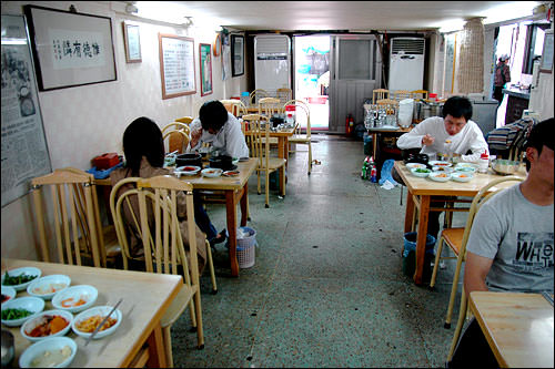 「シゴルヤチェテンジャン」は、江南(カンナム)駅の近くに位置するテンジャン(味噌)ビビンバが評判の食堂です。庶民的な雰囲気で素朴な定食屋で、料理を注文すると出てくるパンチャン(おかず)がたくさん運ばれてきます。看板メニューのテンジャンビビンバは、野菜やナムルをご飯に入れ、ごま油とコチュジャンで味を整え、最後にピリ辛の味噌汁をかけてよくかき混ぜて食べる即席ビビンバで、野菜たっぷりでヘルシーな味わいです。