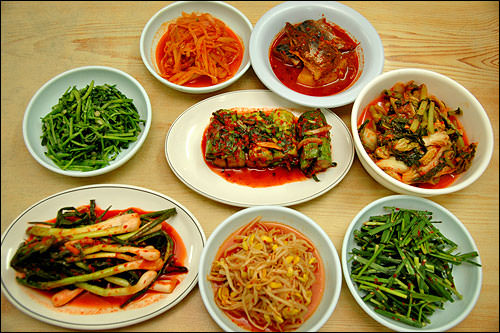 席につくと「テンジャンビビンバ?」と聞かれ、「ネー」と言うとすぐにおかず類が運ばれて来ました。
