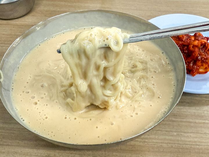 濃厚な豆のスープにツルツルの麺に、キムチをのせて食べるとまた美味しい。
