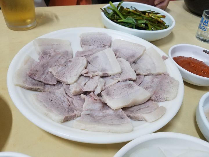 デジクッパとスンデクッパ、スユク(小)を注文。早速スユクの登場です。茹で豚はしっとりとしながらも油こくなく、甘めのタレを付けていただくと、肉のうまみが口の中に広がります。テソン焼酎との相性もばっちり!デジクッパ通りの人気店をしのぐ美味しさです。