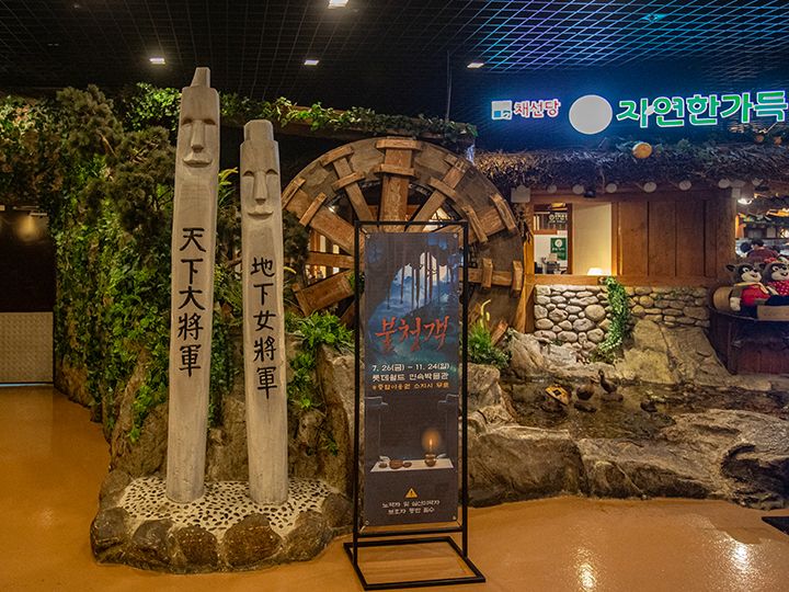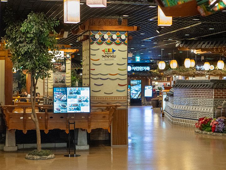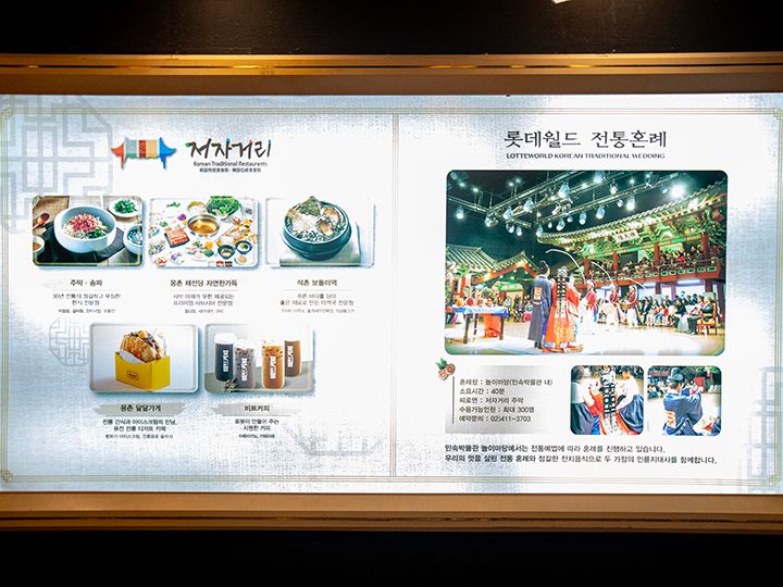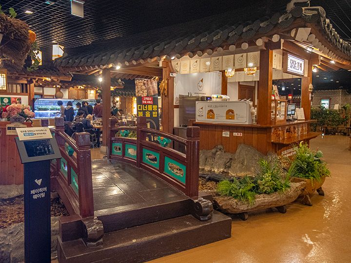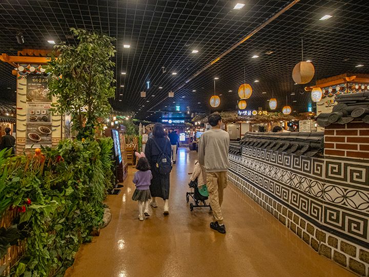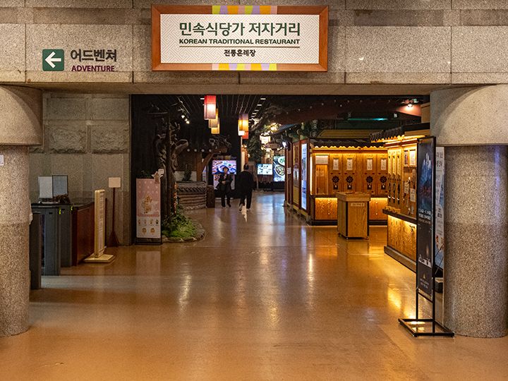 ソウル・蚕室(チャムシル)の遊園地「ロッテワールド」の建物3階には、博物館とレストラン街があります。伝統食堂街は朝鮮時代の街並みを再現した造りで、瓦屋根の家や藁ぶき屋根の家など、韓国の時代劇ドラマのセットに足を踏み入れたような感覚に浸れることでしょう。ビビンバといったお食事ができる韓国料理店や、マッコリやチヂミで乾杯できる居酒屋もあります。また、チマチョゴリ(韓服・ハンボッ)を着て結婚式を挙げる「伝統婚礼会場」にもなっているので、週末、運が良ければ、結婚式を挙げるカップル・家族も見かけられます。「ロッテワールド」で遊んでいる途中でも再入場券をもらえば、途中のお食事処として利用できます。