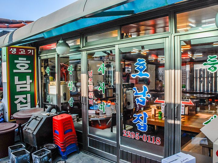 ひたすら照明が明るいのが助けです。北門を出るとすぐに焼肉横丁が左にあります。焼肉横丁を進みそこから3,4軒目の右側に「ホナムチッ(焼肉)」があります。