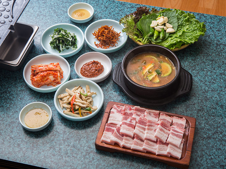 | 主なメニュー | 野菜包みご飯(サンパッ)、黒豚石焼ビビンバ、黒豚の五枚肉(オギョプサル)など |