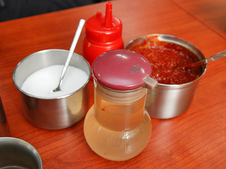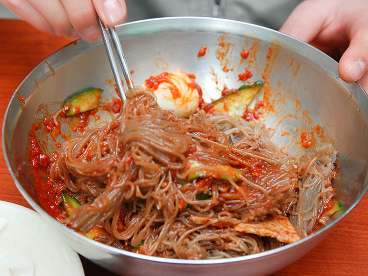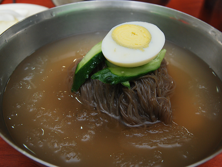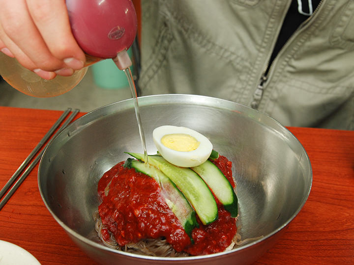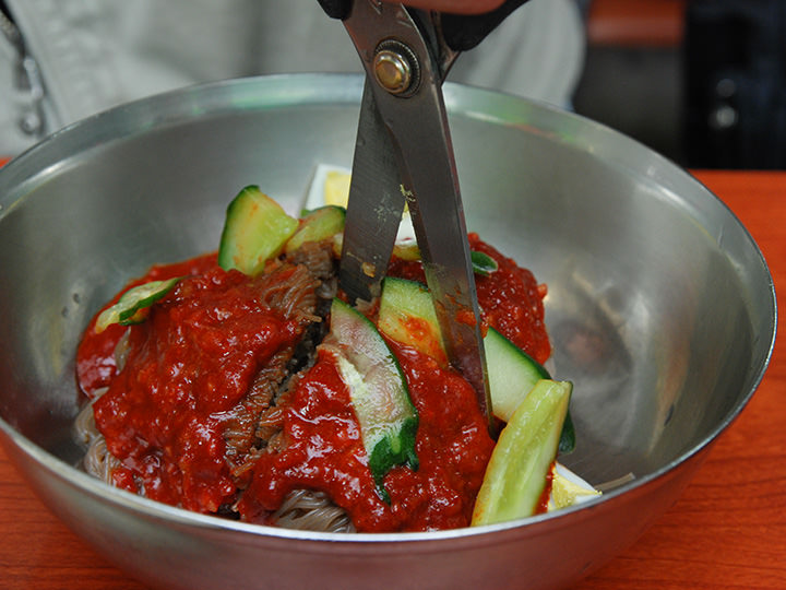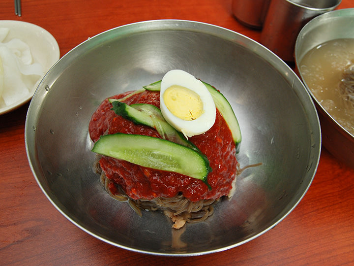 地下鉄2号線と9号線が乗り入れる綜合運動場(チョンハッウンドンジャン)駅近くの飲食店街にある「海州冷麺(ヘジュネンミョン)」は、メニューがビビン冷麺、水冷麺、替え玉の3つしかない冷麺専門店です。真っ赤なソースがかかったビビン冷麺は、激辛で有名。18種類もの材料でつくった秘伝のソースが、辛いだけではない奥行きのある味にしています。辛くない水冷麺は、さわやかで深みのある味。牛骨でだしをとり、13種類の材料で5時間煮たスープを使用しています。セルフサービスのユクス(肉汁スープ)は、コップに注いで頂きましょう。