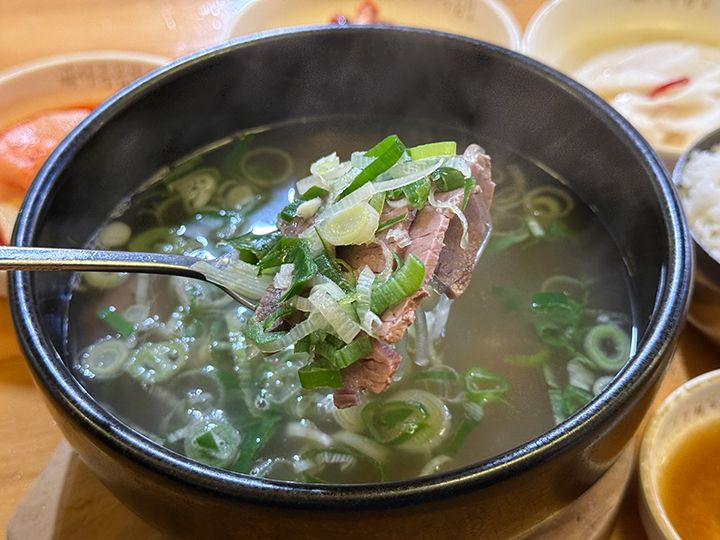 看板メニューは塩味が際立つ滋味深いコムタンと、ピリ辛のヘジャングッ。そのほかにビビンバ、冷麺、大鍋で提供されるカムジャタンなども揃い、おひとりさまからグループ利用まで幅広く対応する、使い勝手の良い韓国料理店です。