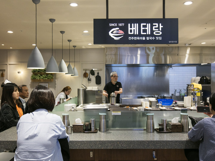 「ベテランカルグクス」または「ベテラン粉食」の愛称でも知られる全州(チョンジュ)・韓屋村の有名店が、ソウルを代表する繁華街・明洞(ミョンドン)に進出!「ロッテデパート」のデパ地下・フードコートの近くに店舗があり、テーブル席や、おひとりさまにも良いカウンター席があります。一番人気のメニューは「カルグクス(手打ち麺)」。他店のカルグクスよりも、もちもちとした麺と、溶き卵がたっぷり入ったとろみのあるスープが美味しいと好評です。その他には冷製麺と野菜を、ピリ辛のコチュジャンソースで混ぜあう「チョルミョン」や、肉汁たっぷりの「マンドゥ(蒸し餃子)」も人気。2人で3つを注文してシェアしあうのが定番で、おひとりさまにはカルグクスが人気です。