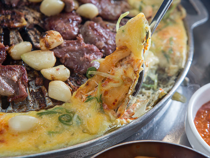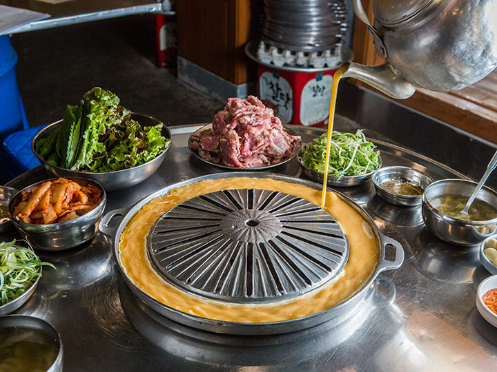 入り口はオレンジ色の看板で、中は奥行きがすごく広く平日の18時代にも関わらずものすごく賑わってました。炭火焼き(練炭?)で網のフチにある鍋におばちゃんが卵の溶き汁を入れてくれ、お好みでネギとキムチを入れてねと言われました。カルメギサルは絶品で、ふわふわの卵焼き?と一緒に食べるとさらに美味しいです。おばちゃんが様子を見にきてもらえ網も変えてくれ、卵も追加してもらえます。