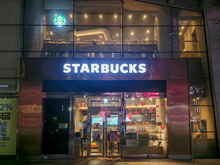 全世界的に人気のコーヒーチェーン店「スターバックスコーヒー」は韓国でも大人気!ソウルを代表する繁華街・明洞(ミョンドン)にも店舗がいくつかありますが、「ウルトラマン」に出てくる怪獣・バルタン星人のような形の建物で有名な、明洞の郵便局の1~2階にもスタバが入店しています。この店舗では韓国各地のオリジナルマグカップやタンブラーが買えるほか、2階の窓側席からは、向かい側にある「新世界百貨店」の大型スクリーンの映像が、冬でも温かい室内から鑑賞できるのがポイント。1階が注文・ピックアップカウンターで2階がイートインスペースです。2階席は数に限りがあるので、先に座席を確保した後、注文するというシステムで運営しています。