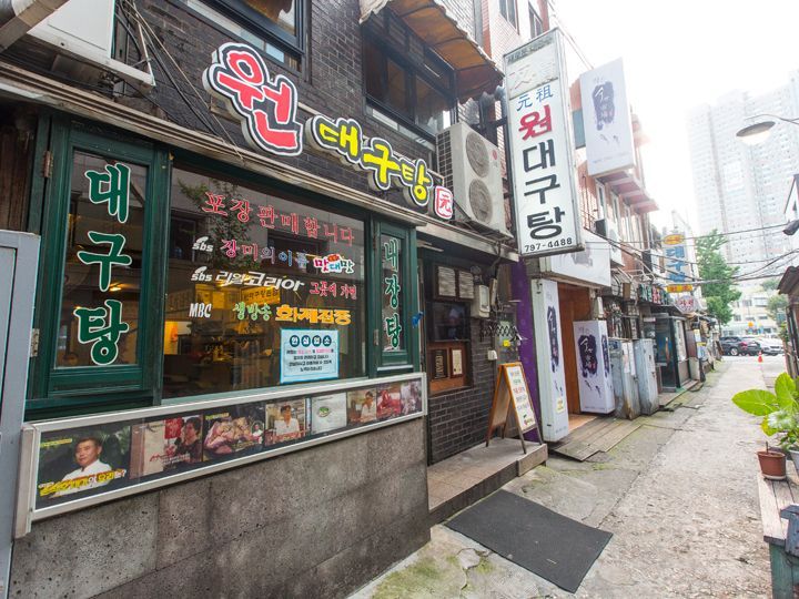 三角地(サムガッチ)にある「元(ウォン)テグタン」は、タラを野菜と赤いスープで煮込んだ「テグタン」のお店です。1979年オープンでソウル市外にも支店を持つ有名な老舗で、1、2階にテーブルと座敷の約200席を持っています。「テグタン」は、大きな鍋にタラの身、頭、卵、内臓のほか、セリとモヤシがたっぷり入っています。強い火力を使って調理するため、身が引き締まったタラを味わえます。お好みでうどんやラーメンを追加したり、焼き飯でシメると良いでしょう。 辛いものが苦手な方は、唐辛子を使わない「チリ」鍋をどうぞ。