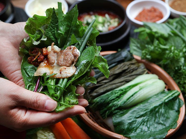 かんなの削り屑のようにくるくる丸まった様子から「テペサムギョプサル」(テペは韓国語でかんなと言う意味)と呼ばれる「豚の薄切り三枚肉」。レストランブランド「THE BORN Korea(ザ・ボーン・コリア)」が運営する「ペク・ジョンウォンの元祖サンパッチッ」は豚の薄切り三枚肉を韓国で初めて特許登録した、野菜包みご飯(サンパッ)専門店です。定食メニューは2人前から。20種類のお野菜やご飯が含まれ、合わせ味噌は別料金です。お店は各地にありますが、この支店は地下鉄1号線と4号線が乗り入れる「東大門(トンデムン)駅」の北側にあり、東大門の繁華街とは思えない静かな路地裏にあります。定食と合わせ味噌を注文してヘルシーな料理を味わってみましょう!