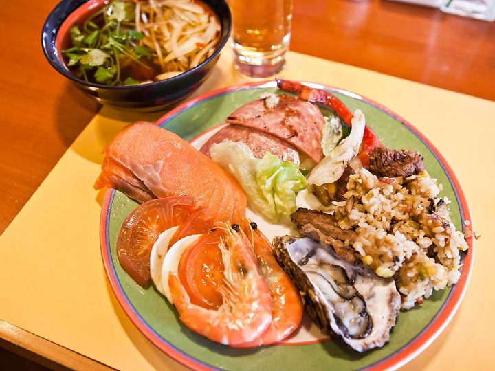 2013年10月平日、夜18時半に行きました。店内は大きなスクリーンにオードリーヘップバーンの映画を上映しており、落ち着いた雰囲気で食事ができました。宿泊客の方?お一人様の方も沢山いました。お寿司の品数は少ないですがスモークサーモン、普通のサーモン、カルフォルニアロールが別途あり、チャーハンもあったので私は充分でした。焼きたてのステーキは美味しかったです。今日はすっごい食べるぞ!!と気合入れて行くブッフェではない感じ。ビールが飲み放題だから、ゆっくり飲んで話しながら食事するにはお勧めですよ。