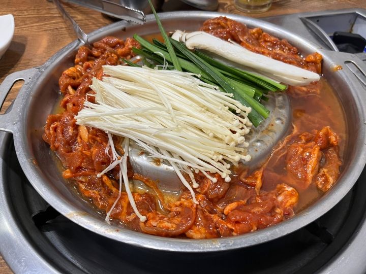 しばらくするとパンチャン類が運ばれ、テジプルコギの鍋もやってきました。