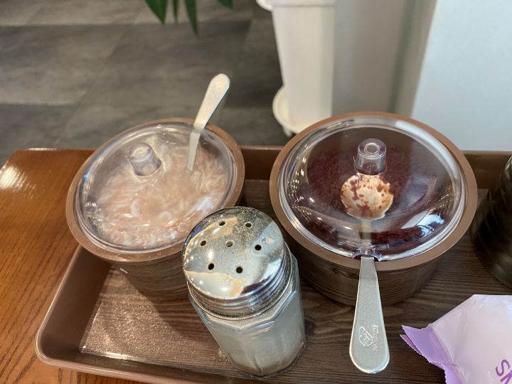 メニューを見ないで「テジクッパ」と注文して出てきたのは、豚もも薄切り肉のスープとごはん別々のものでした。スープはそのままでは塩気がないので、机に置かれたオキアミや唐辛子の調味料で調整が必要です。