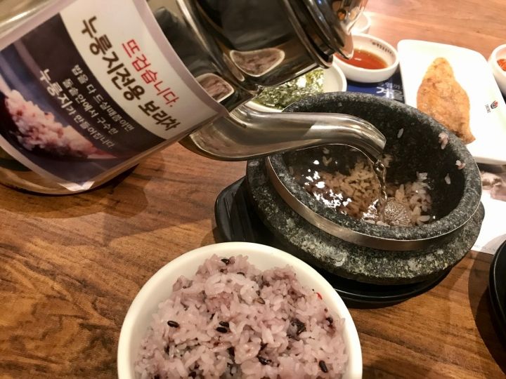 ご飯は釜飯。取り皿に移して、お湯をかけてヌルンジを作っている間にチゲを頂きます!豆腐と牡蠣のコラボが美味しかった。色は真っ赤ですが、ほとんど辛くないので大丈夫です。卵をとくと更にマイルドになって美味しいです