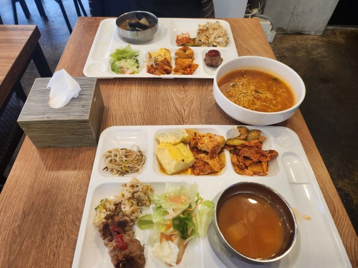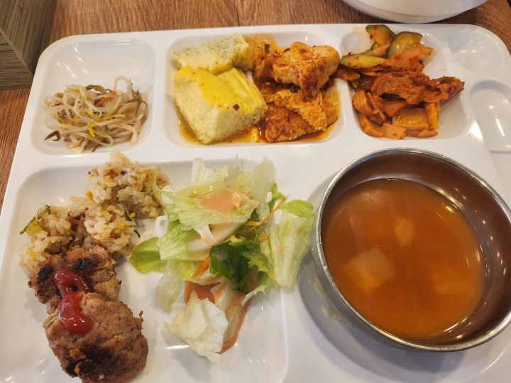 目の前でスタッフが作ってるのが見えたので安心して食べられるし、家庭の味!って感じで最高スープも熱々で出てくるし、健康な昼飯でした。