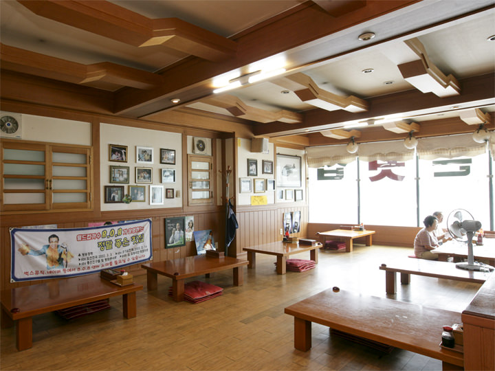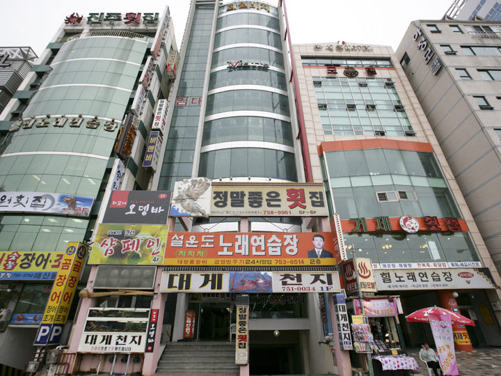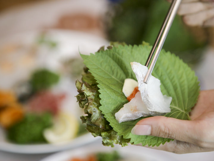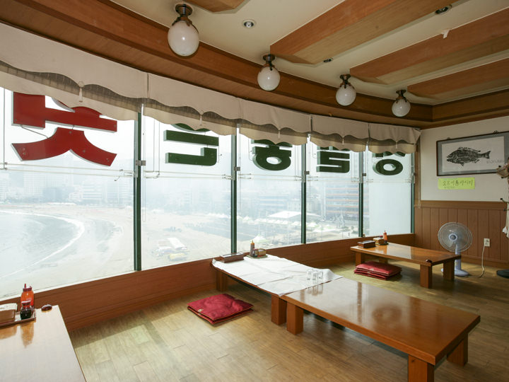 新鮮な海の幸が堪能できる釜山・広安里(クァンアルリ)の海岸沿いには、刺身や魚介料理店が入ったビルがひしめきあっており、「チョンマルチョウン フェッチッ」もその一画にあります。このお店はビーチ沿いのビル5階にあるので、昼間はビーチの景色を、夜はダイヤモンドに輝く「広安大橋(クァンアン・デギョ)」の夜景を眺められ、まるで展望台のようです。コース料理またはお刺身の単品が注文でき、ぷりぷり・天然のヒラメやタイが特に人気。お刺身は、わさび醤油のほか、チョコチュジャン(酢入り唐辛子味噌)などに付けて、サンチュやエゴマなどの野菜に巻いて食べるのが韓国式の食べ方です。