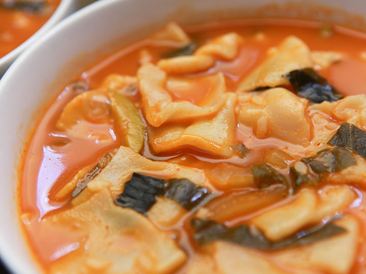 「ポンシネ オルクンスジェビ」は、永登浦(ヨンドゥンポ)駅前の飲み屋街にある食堂で、1986年にオープン。約40年にわたって、メニューは「オルクンスジェビ(ピリ辛すいとん)」の1つだけ、という、こだわりの専門店です。スジェビとは、すいとんに似た韓国の小麦粉料理で、1人前の器の中には、たっぷりのスジェビと野菜の入って運ばれてきます。「オルクン」とは、ピリッとした辛味にキムチの旨味と酸味がプラスされたもので、さっぱりといくらでも食べられそうな味わい。スジェビは、弾力があってつるつる。手でちぎられているためか、スープともよく絡みます。さらにご飯も入って、食べ応え十分です。