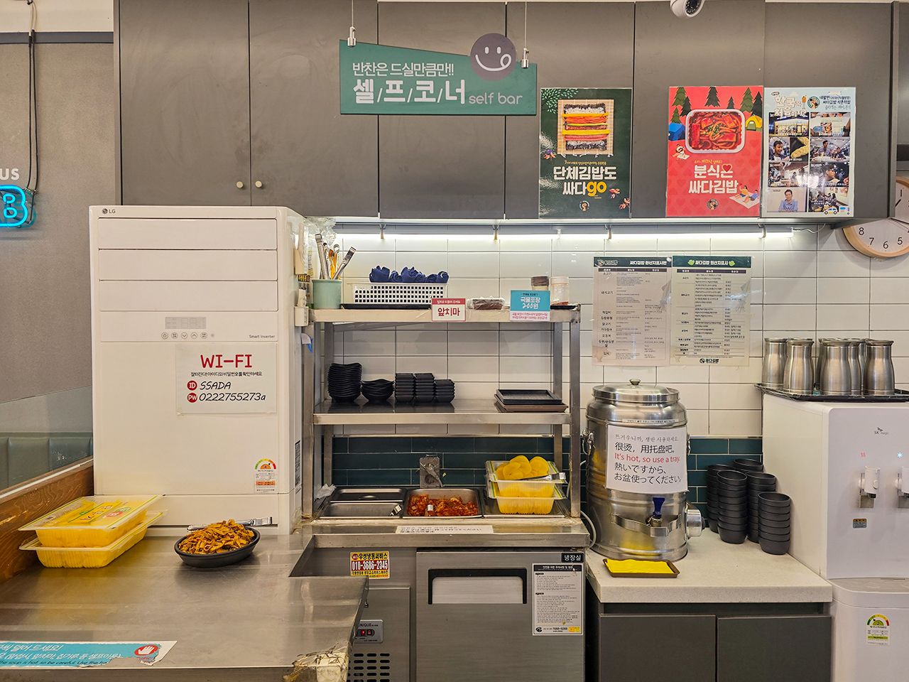キムチやスープなどのおかずもセルフで奥に専用コーナーがあるんですが、