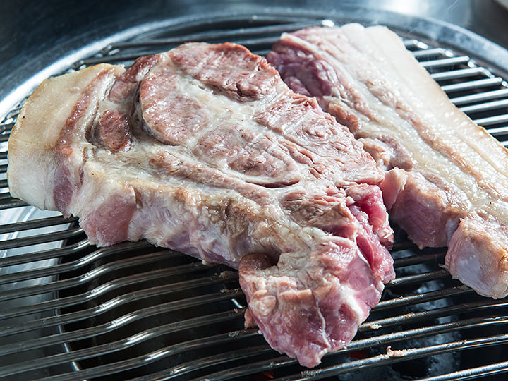 「済州トンサドン」は、済州島(チェジュド)に本店をもつ豚焼き肉専門店です。済州島は養豚で有名な土地で、豚肉が美味しいことでも有名です。そんな済州島産の豚肉のオギョプサル(豚の五枚肉)とモクサル(首肉)がセットで味わえます。分厚く切り出された豚肉を、炭火でじっくり焼いていくと、表面がこんがりコーティングされ、旨みの肉汁が流れるのを防ぐ効果があります。焼きあがったお肉は、まずは塩のみで、臭みのない柔らかな肉質を噛みしめてください。網の中央で熱する、ミョルチジョッ(カタクチイワシの塩辛)を使った特製ソースも本場・済州島の味。塩辛独特の風味が唐辛子の辛みやニンニクの香りで中和され、豚肉との不思議な調和を生み出します。