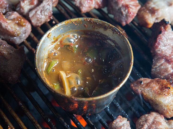チェジュ島式は炭の中に、簡単に言うとアンチョビ(カタクチイワシの塩辛オイル)を置いて、焼いた油が下に落ちるソースを付けて食べるのが主流そして私が大好きな部位がモクサル(首肉)が分厚いのに柔らかい…