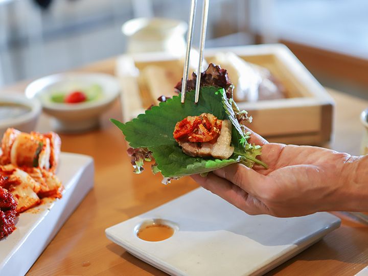 日本からの観光客にも人気のメニュー・ポッサム(豚肉を茹でたもの)とマッコリが、韓屋式レストランで味わえる、という韓国旅行の醍醐味が詰まったお店です。店内では韓屋の木のぬくもりを感じたり、中庭が眺められます。ポッサムと、ピリ辛く味付けした素麺のセットメニューが2人前から注文できます。お店の場所は、ソウルで人気の観光エリア「北村韓屋村(プッチョン・ハノンマウル)」にあって、最寄り駅の地下鉄3号線・安国(アングッ)駅から歩いてすぐ。食前・食後には周辺を散策したり、カフェ巡りをするのにも便利な立地です。